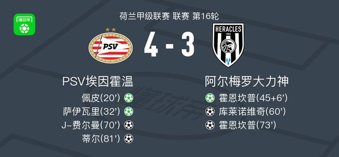 北京时间12月14日,荷兰荷甲联赛第16轮,埃因霍温主场迎战阿尔梅洛·大力神。比赛中,埃因霍温取得领先,佩皮主罚点球,随后萨瓦里也点球破门,帮助球队确立领先优势。上半场临近结束时,阿尔梅洛·赫拉克勒斯凭借霍恩坎普的点球获得一球。进入下半场,阿尔梅洛·赫拉克勒斯发起反击,库列诺维奇接到恩格斯助攻完成破门,将比分再次拉近。随后,J-费尔曼接到佩里西奇的传球,埃因霍温破门,再次扩大领先优势。但客队并没有放弃。霍恩坎普在瓦利德-奇克梅开二度的助攻下再进一球。比赛的悬念一直延续到了最后一节。关键时刻,埃因霍温接德斯特传球,蒂尔破门,为球队锁定胜局。全场比赛结束,埃因霍温4-3战胜阿尔梅洛·赫拉克勒斯。精彩片段第20分钟,埃因霍温球员佩皮主罚点球破门。第32分钟,埃因霍温球员萨伊瓦里主罚点球。上半场补时第6分钟,阿尔梅洛·赫拉克勒斯球员霍恩坎普主罚点球。第60分钟,阿尔梅罗大力神队球员恩格斯助攻库莱诺维奇进球。第70分钟,埃因霍温球员佩里西奇助攻J-费尔曼破门。第73分钟,阿尔梅洛·赫拉克勒斯球员瓦利德-奇克助攻霍恩坎普破门。第81分钟,埃因霍温球员德斯特助攻蒂尔破门。球队阵容 技术统计